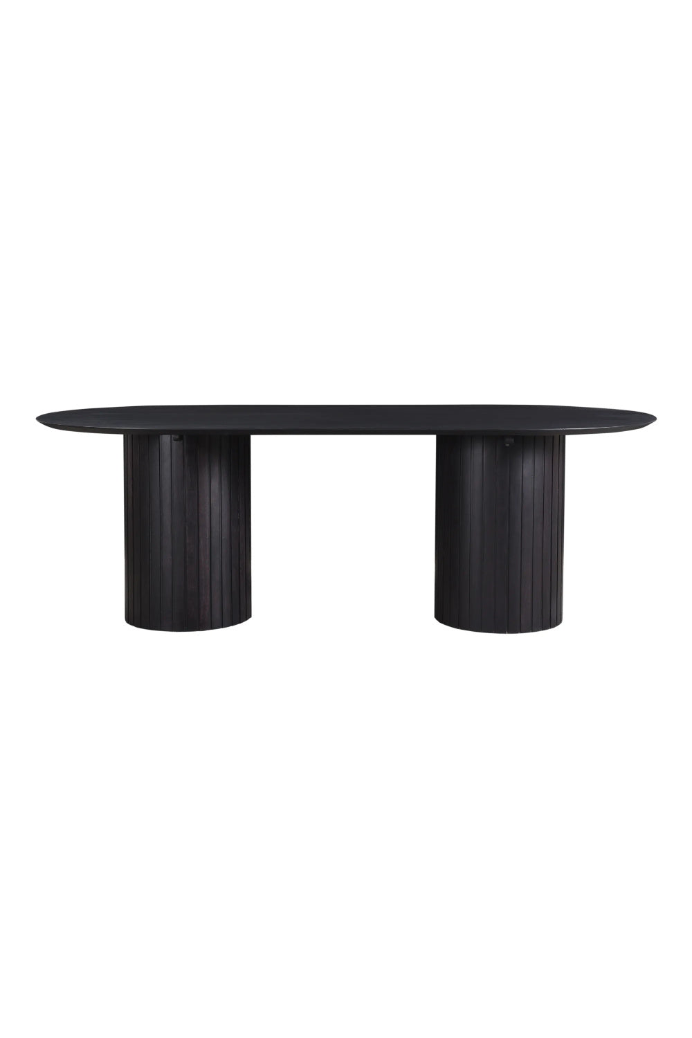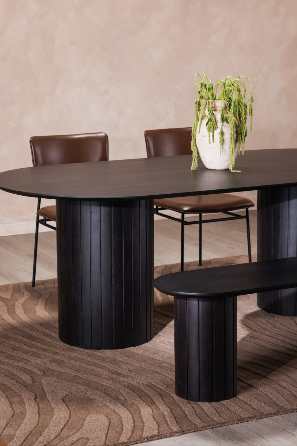A convergence of shape and form, the Povera dining table will serve as the pillar of your dining area. Povera features two large columns supporting an expansive tabletop, their gentle ribbing reminiscent of ripples and waves. With a rich black finish featuring a soft purple undertone that allows the natural wood grain of the Acacia wood to show through, this dining table uses simple geometry and natural materials to form an experience. Offering bold statement appeal, Povera incorporates the elegance of ratio into your dining area.