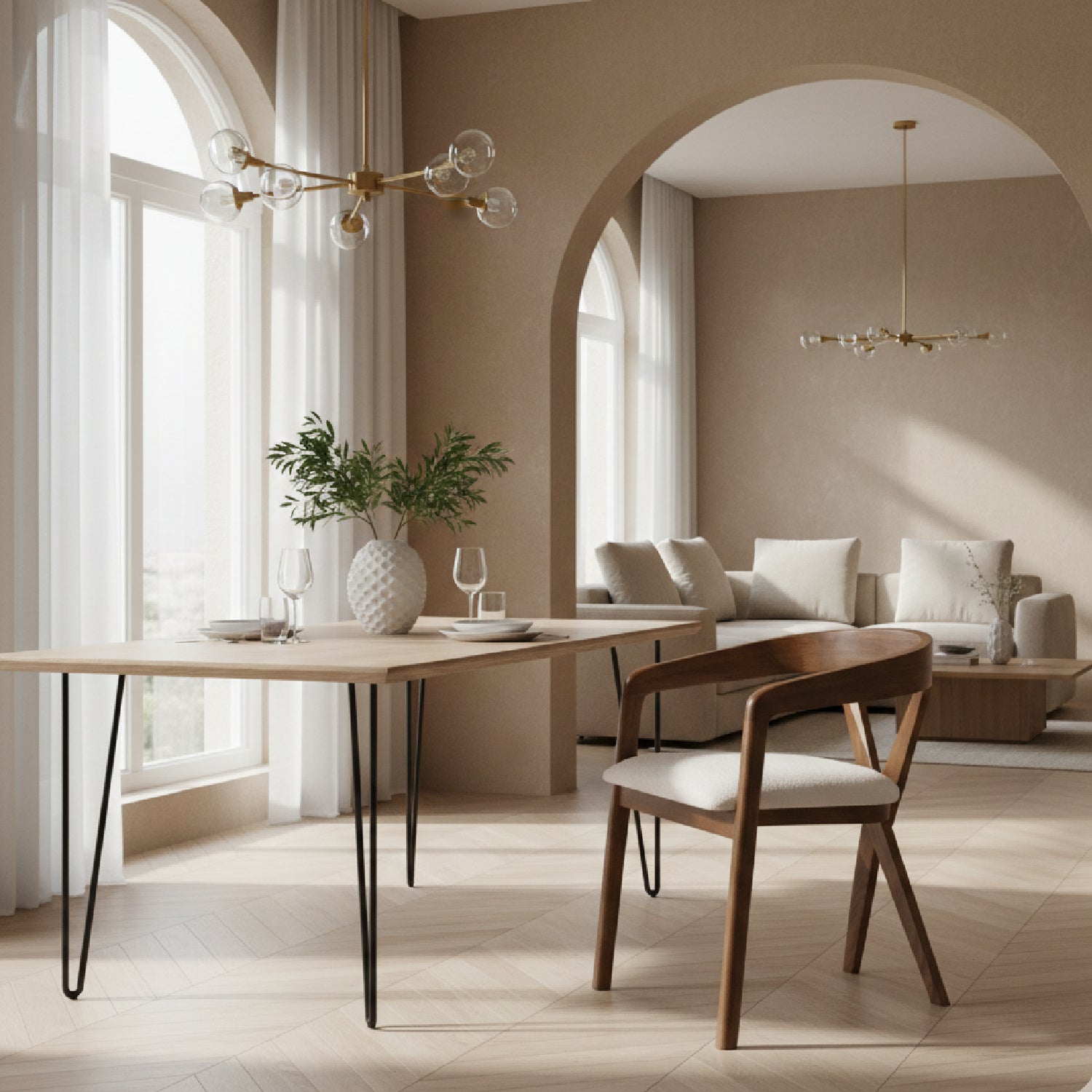 The Modrest Weiss dining chair embodies a sleek Mid-Century Modern aesthetic, showcasing a light brown fabric seat complemented by a rich walnut finish. Its curved armrests seamlessly blend into a unique X-shaped base, offering both elegance and comfort. This chair's refined silhouette and thoughtful design elements make it a striking addition to any dining space, merging style with functionality harmoniously. W23 x D22 x H30 in | Weight 24lbs W58 x D56 x H76 cm | Weight 11kgs Seat Dimension: W20 x D17 x H20 in | W9 x D8 x H9 cm Arm Height: 27in | 12cm Frame | Walnut Finished Solid Rubberwood Upholstery | 100% Polyester