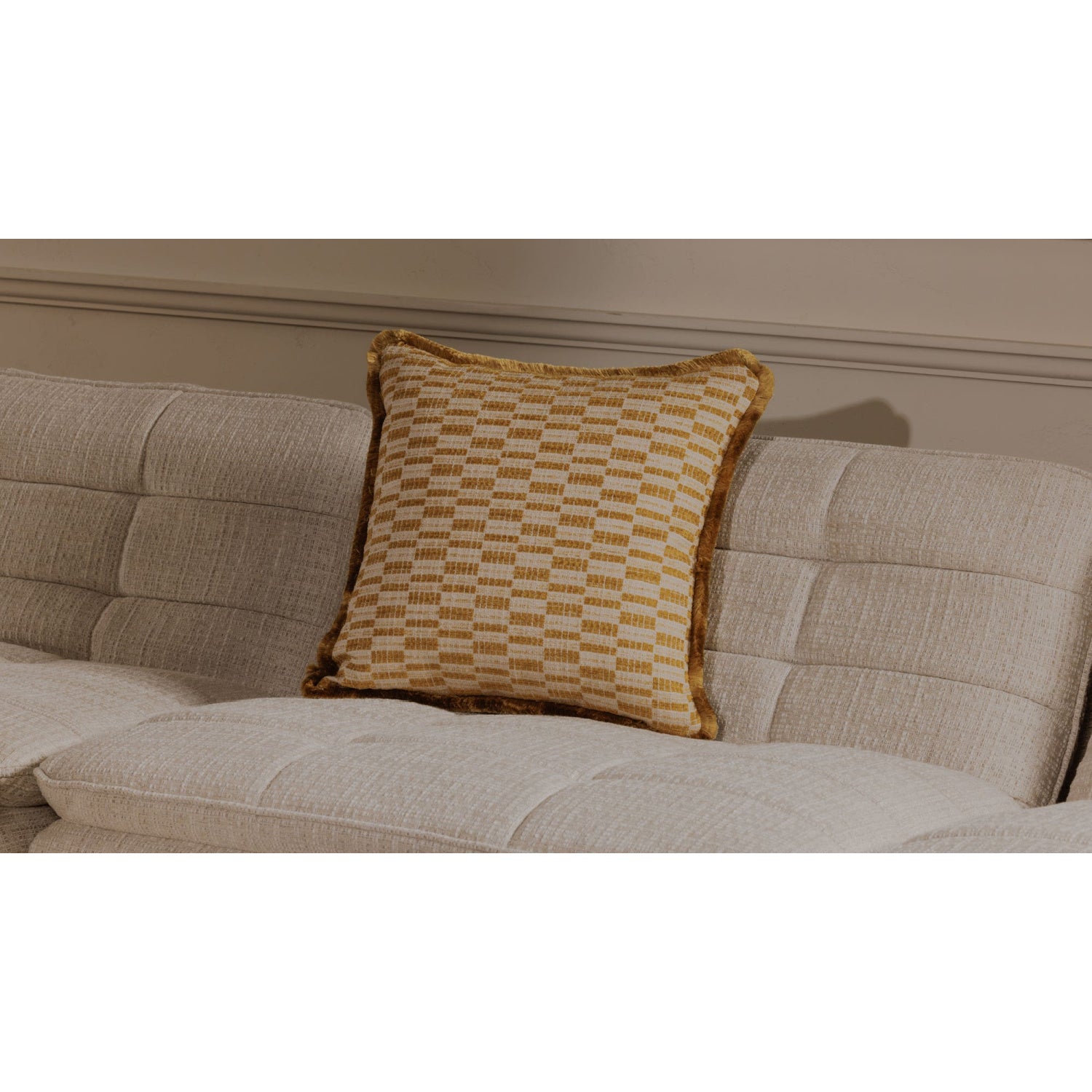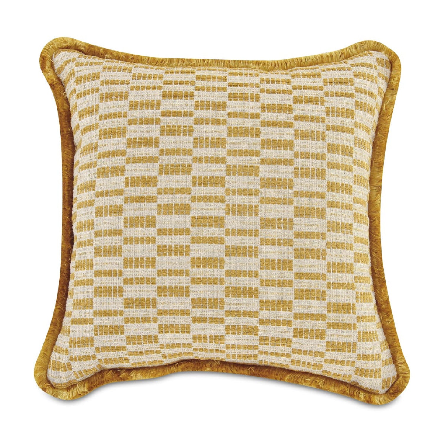 The Leone cushion adds vintage charm and contemporary flair with its bold geometric print in vibrant chartreuse. Meticulously crafted with a dense fringe trim, this Art Deco-inspired accent piece offers comfort and enduring character.