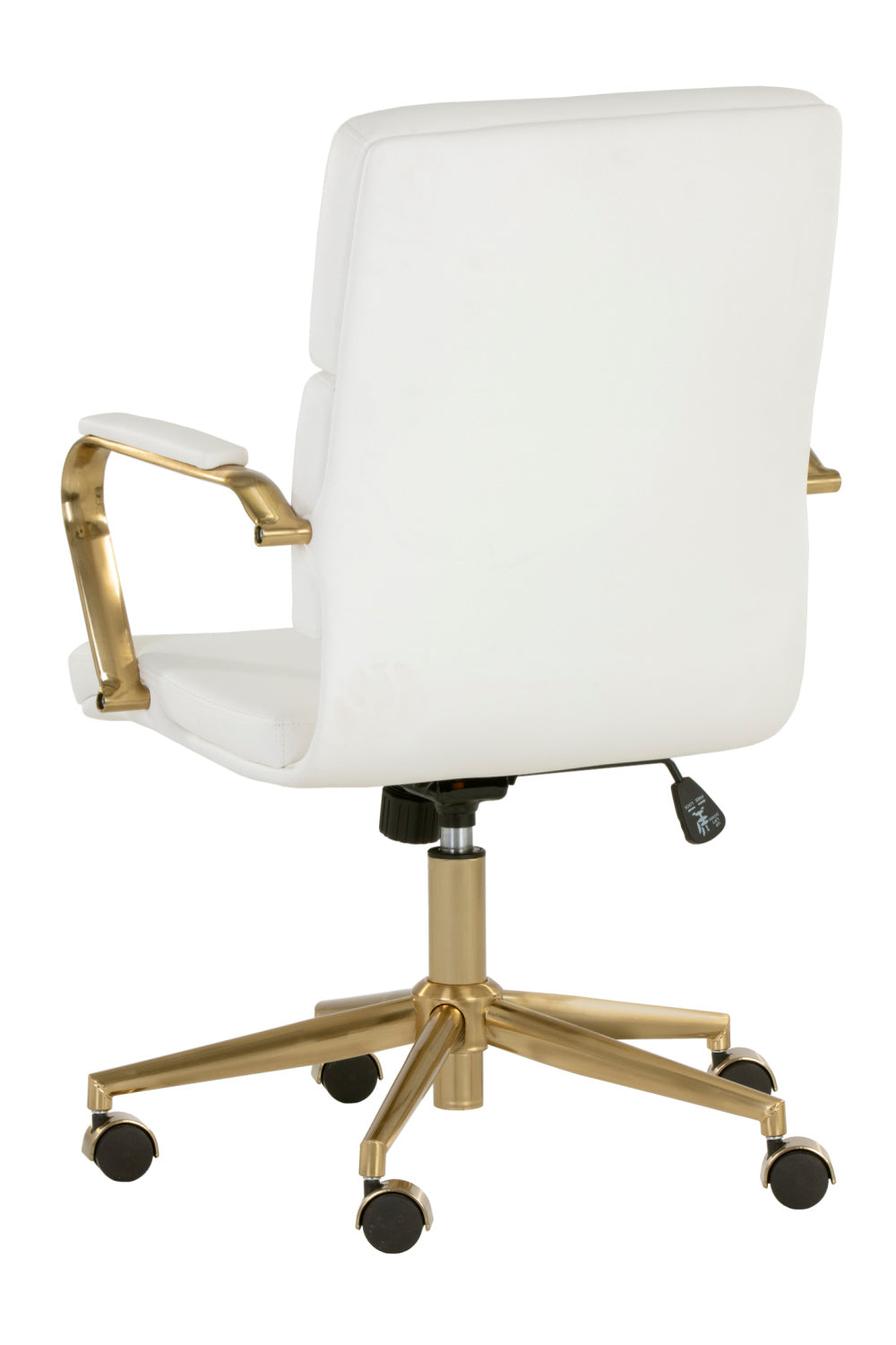 Create a stylish and functional workspace with this stunning modern office chair. Stocked in faux leather and features generously padded seating for optimal comfort. Completed with castors for added mobility, and a gold stainless steel frame. Handle With Care: This design has been crafted with faux leather. Faux leather is manufactured to reflect the natural characteristics of leather; as such, color variations, markings wrinkles, grooves, and light scratches are appreciated characteristics. No two pieces will be alike. Visit our Product Care page for more information on how to ensure the lasting beauty of this piece.