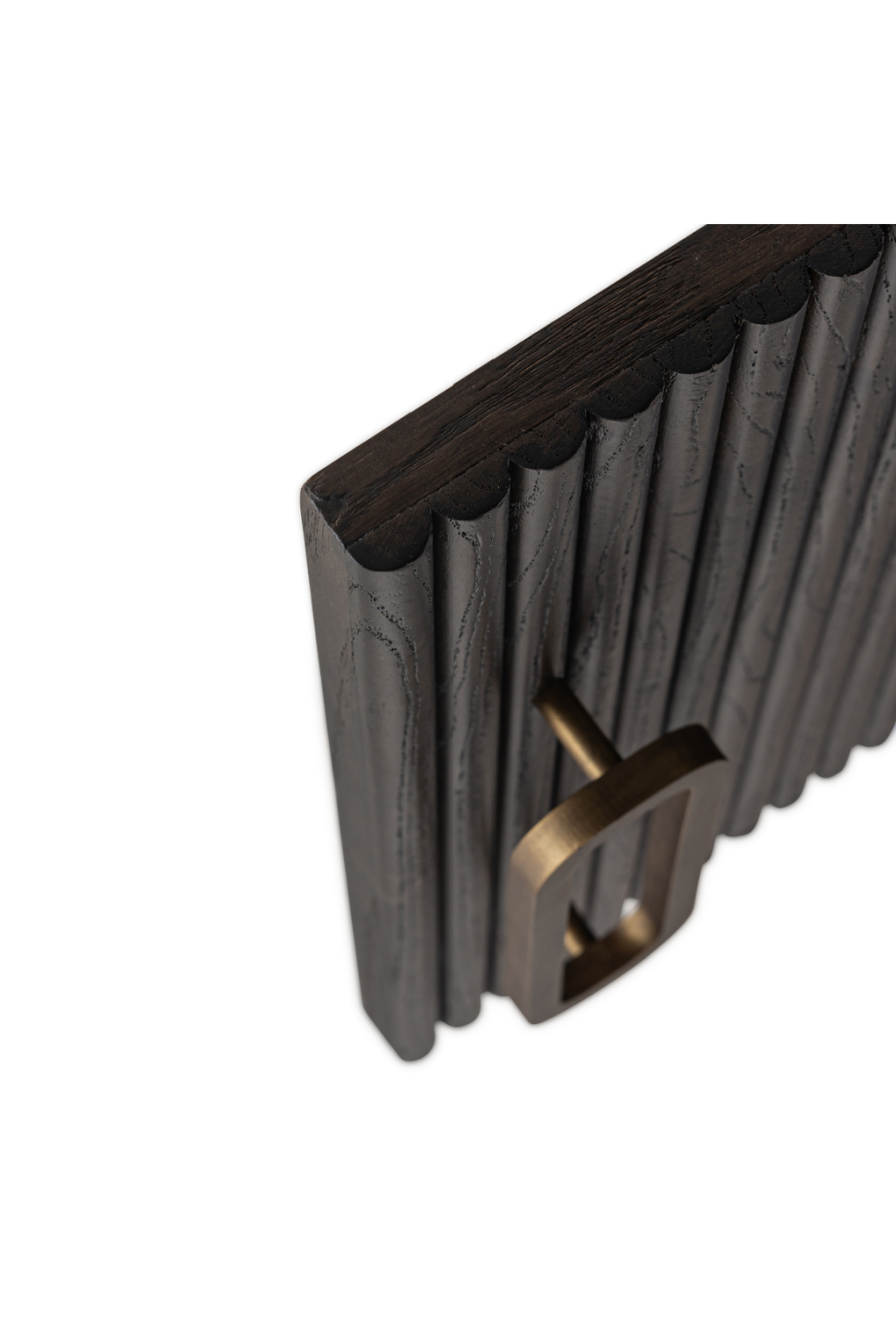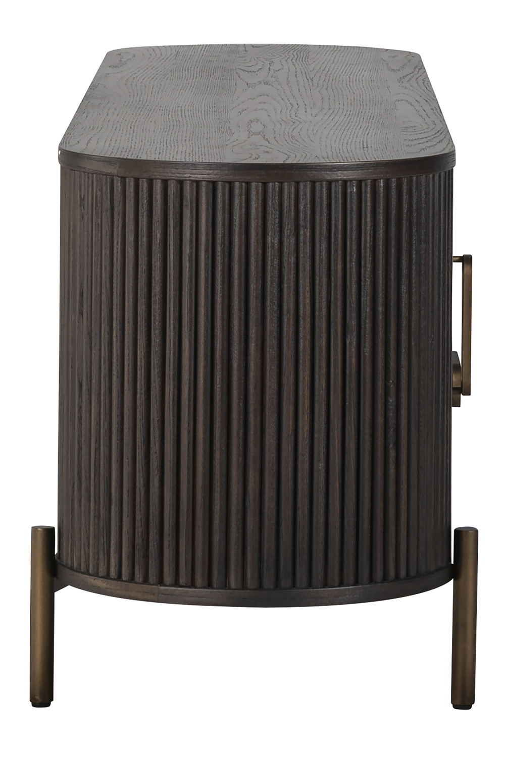 A chic TV Unit crafted from oak wood in a dark finish and vintage brass metal accents. Luxor by Richmond Interiors features a unique aesthetic with its oval top and softly ridged veneers. It offers an open compartment and drawer between two cabinets, a generous space to store and tidy up your things.