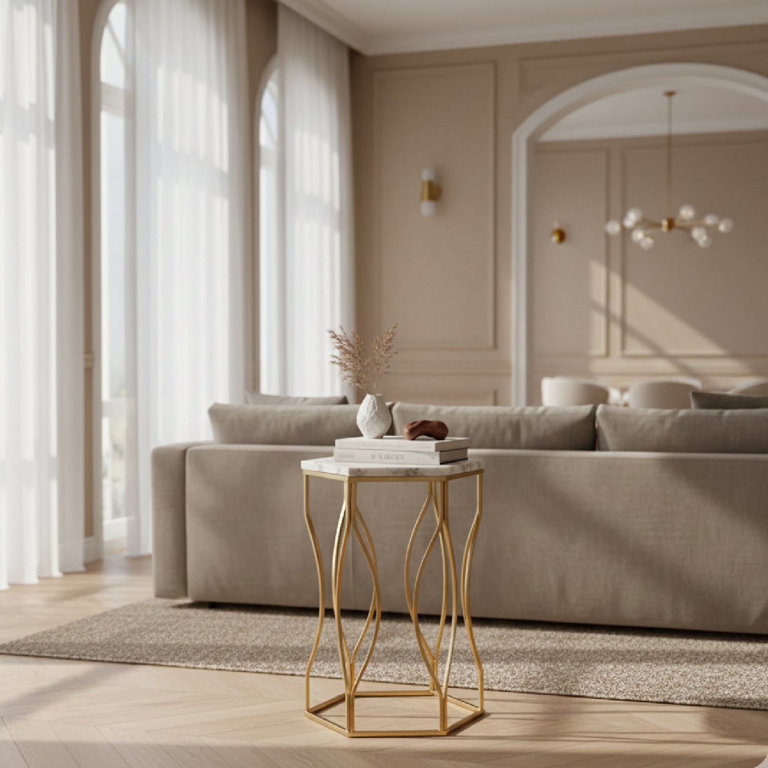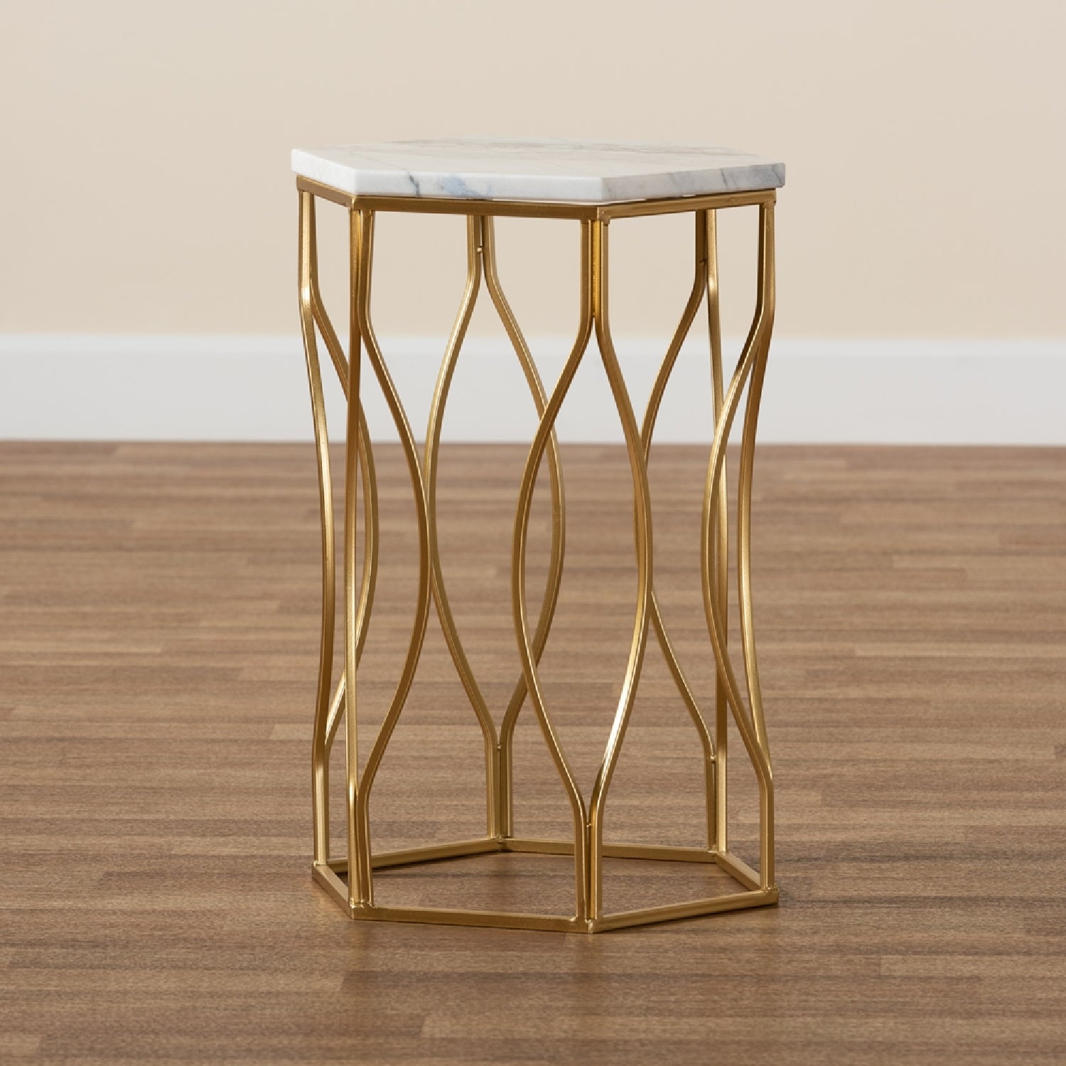 Give your space a beautiful yet practical accent of modern design with the Kalena end table. This lovely piece is comprised of a solid metal base topped with a clean marble tabletop. The base features a smooth openwork design that allows light to flow more easily throughout the room. The Kalena will arrive fully assembled and utilizes a hexagon-shaped tabletop with crisp angles that exude geometric charm. A convenient and compact addition, the Kalena injects modern glamour to any interior space.