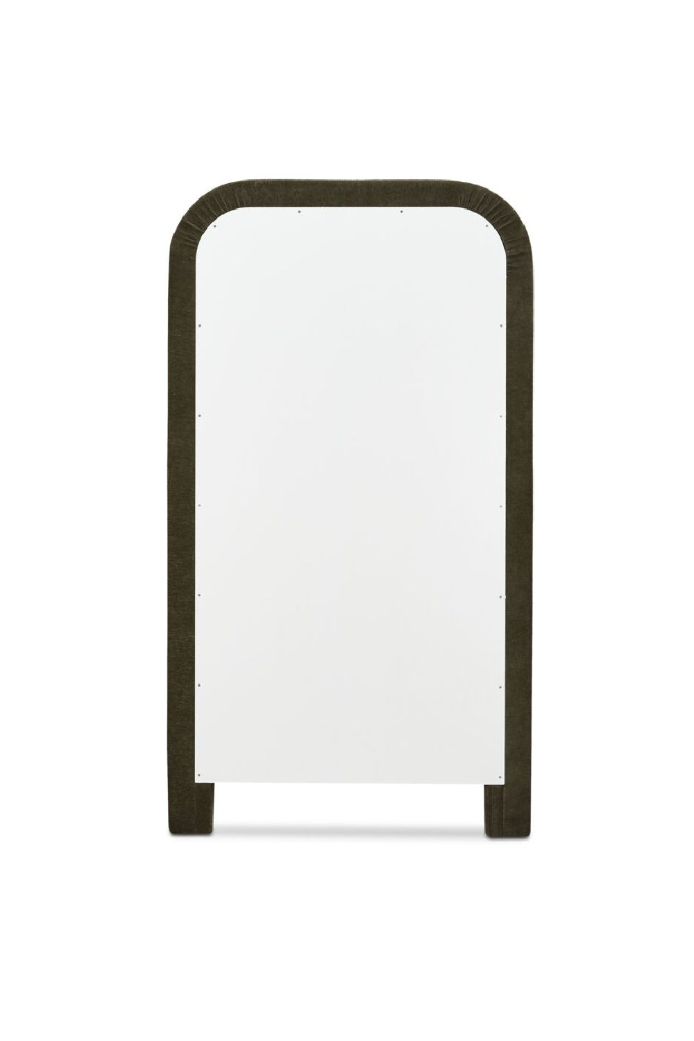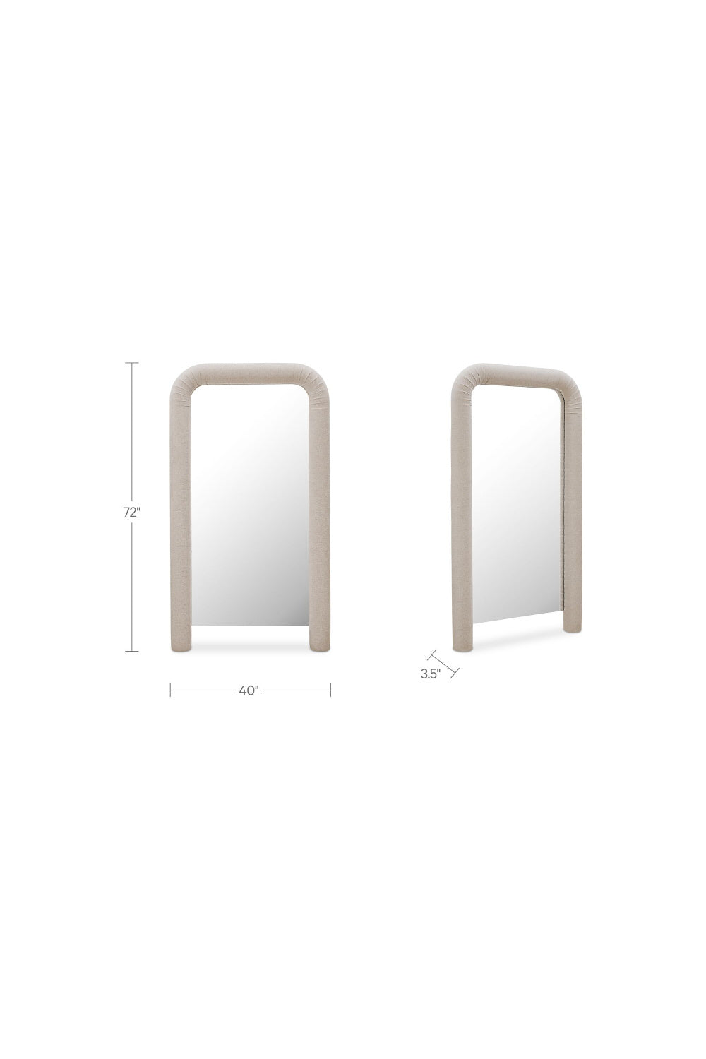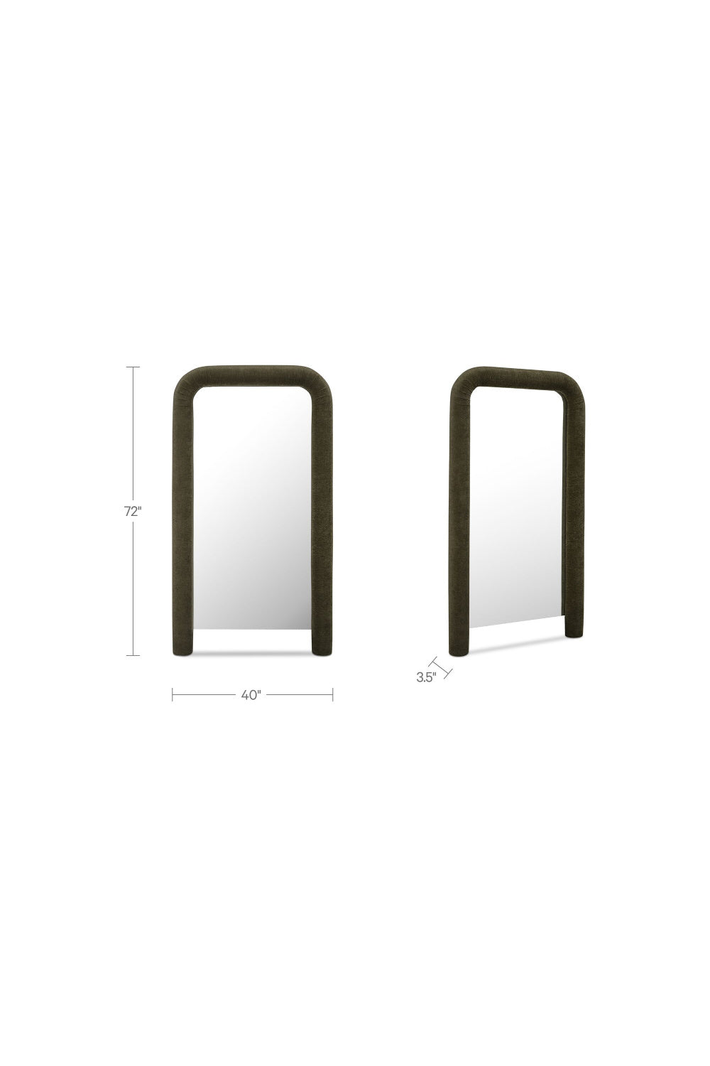 The Ellison mirror's clean lines and gently rounded silhouette are enhanced by meticulously ruched corners and sumptuous fabric upholstery. Generous proportions punctuate this understated piece.