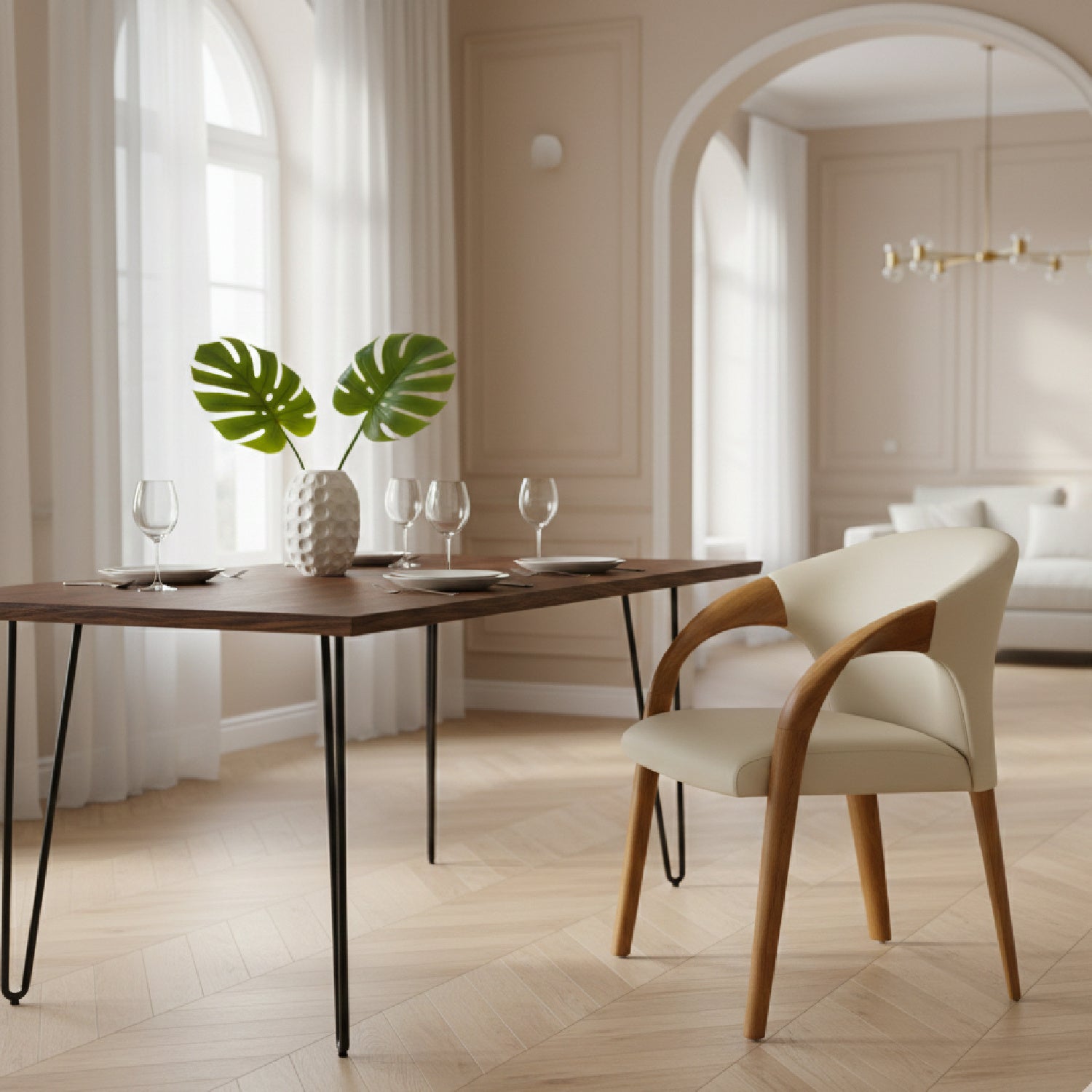 The Modrest Wynetta Dining Chair combines mid-century modern design with contemporary elegance. Upholstered in soft gray vegan leather, its inviting curves and padded seat ensure comfort, while the walnut wood legs and arms add a touch of warmth and sophistication. The sleek silhouette and stylish finish make it a perfect addition to any dining space, effortlessly enhancing your décor. Ideal for those seeking a blend of form and function, this chair embodies a chic yet practical aesthetic that complements various styles.