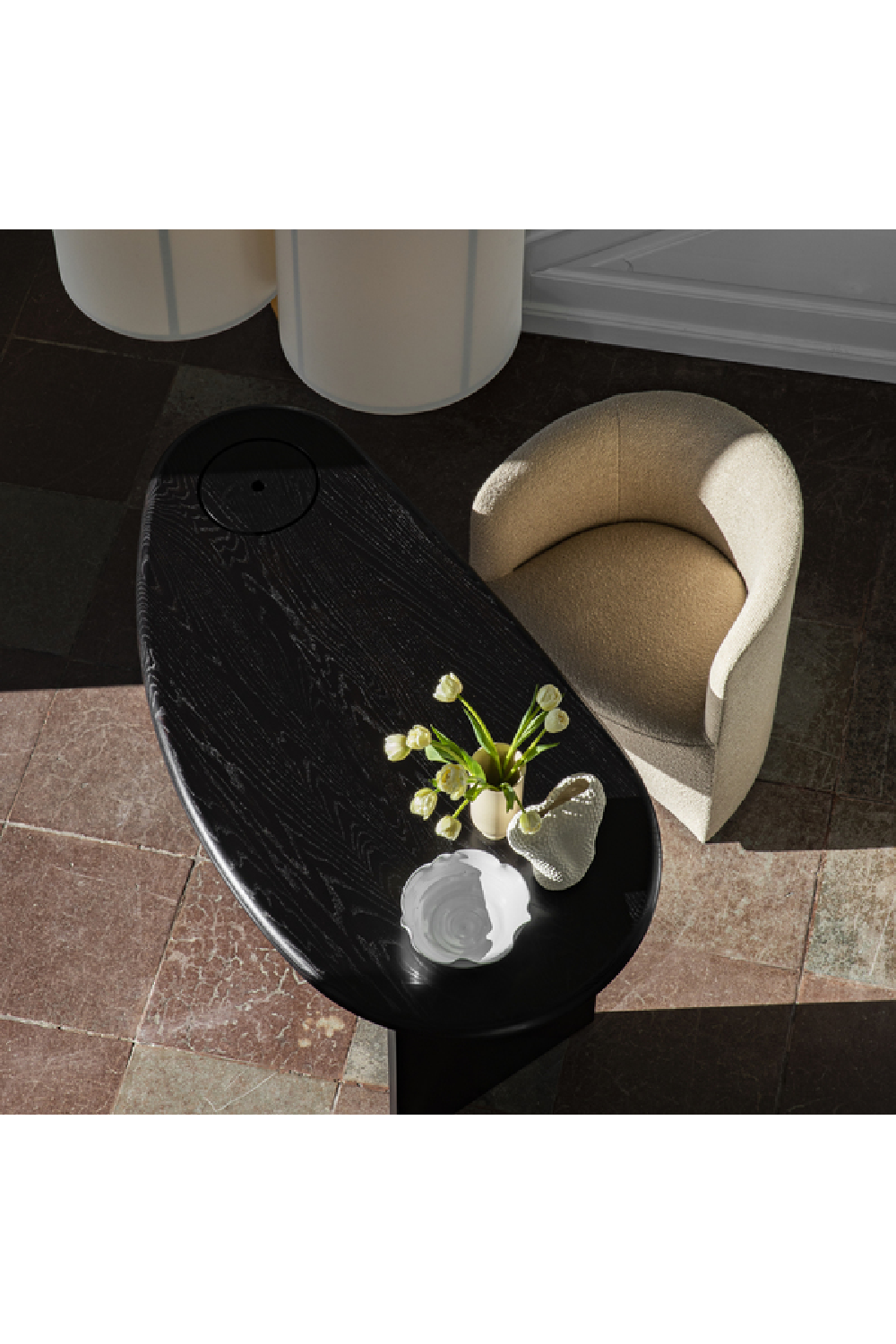 The Eclipse Desk is a celebration of materials and form. Named after its concave and convex form that resembles the illuminated passage of celestial bodies in the sky, the Fred Rigby design has a distinctive, asymmetrical silhouette that invites to touch. Available in black-lacquered oak and oiled natural oak with a black painted leg, the tabletop is fitted with a lid that lifts to reveal hidden storage within the supportive steel column, ensuring desk space remains free of clutter. Designed to stand alone as a centrepiece in the middle of a room or for placement up against a wall as a more conventional piece of home office furniture, its intriguing form draws the eye.
