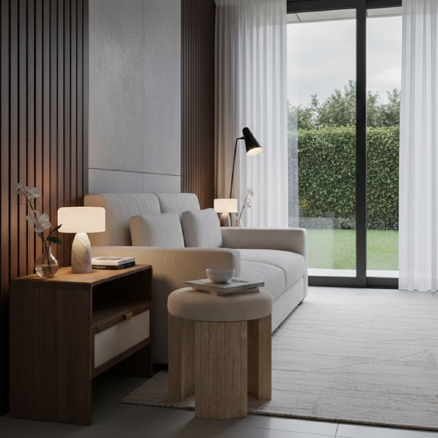 - Materials: 100% polyester upholstery, travertine base