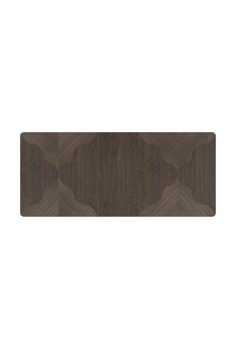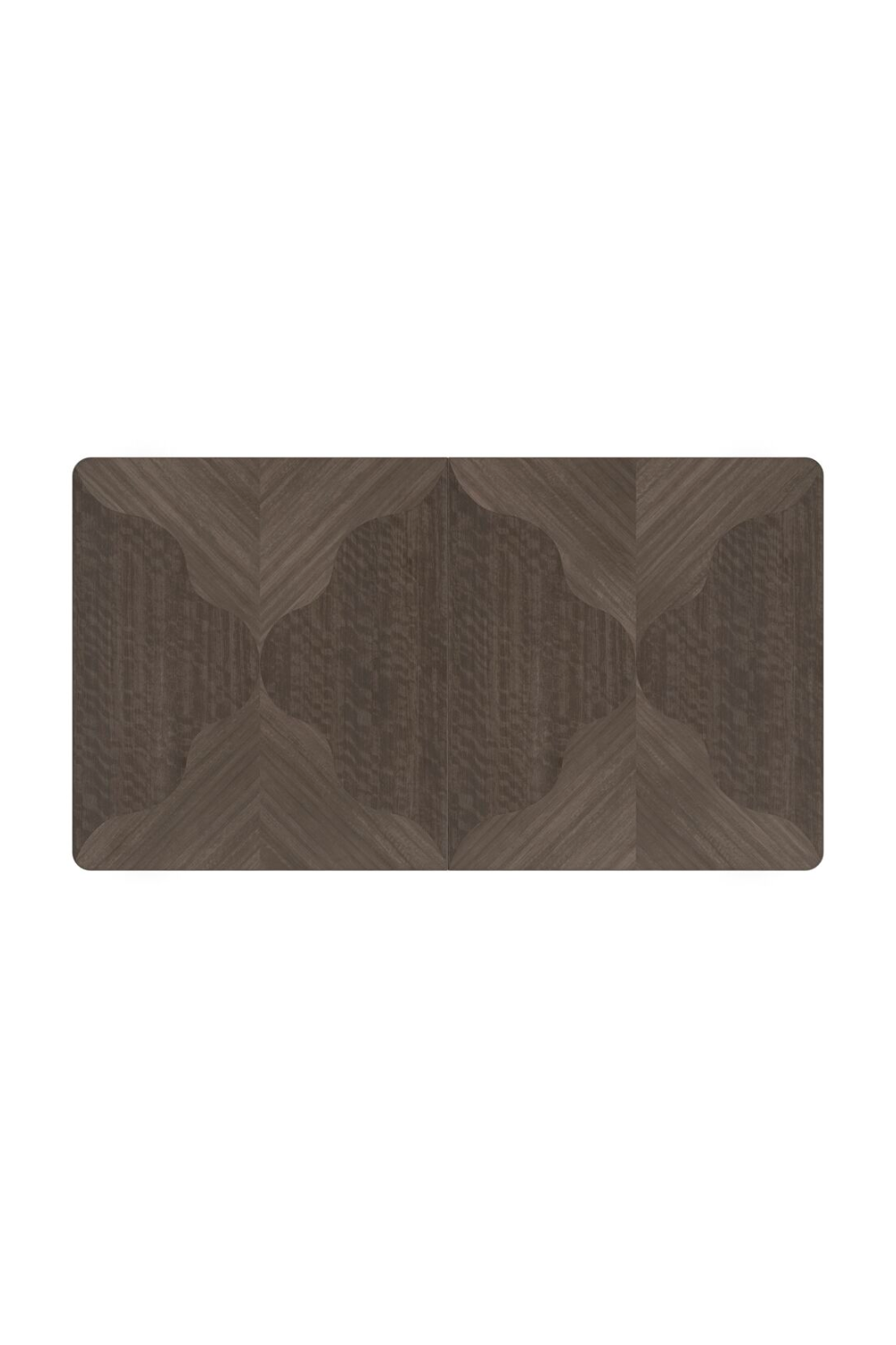 Taking inspiration from the infamous illusion known as Rubin’s Vase, this parsons-style dining table draws the eye with an abstracted pattern on top in a mix of dyed tupelo and eucalyptus veneers. Tall column-shaped legs are accentuated by metal ferrules and trim in Polished Silver. Two 22” leaves allow you to easily extend space for seating when entertaining.