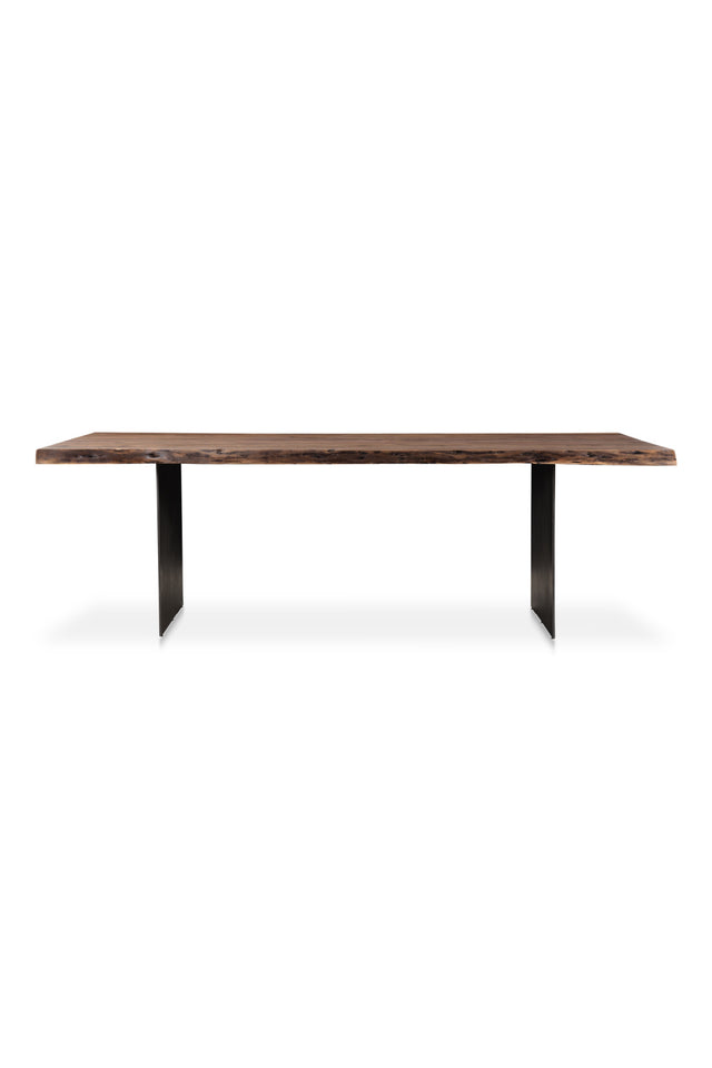 Strength and subtlety meet in harmony with the Howell dining table. Its solid acacia tabletop features a live edge, with knots, whorls and grain serving as a glorious reminder of the wood’s organic natural origins. An addition of grace comes from the two razor-thin legs, composed of sturdy dark iron. Whether you're looking for an industrial or contemporary piece, this table will be the perfect fit.