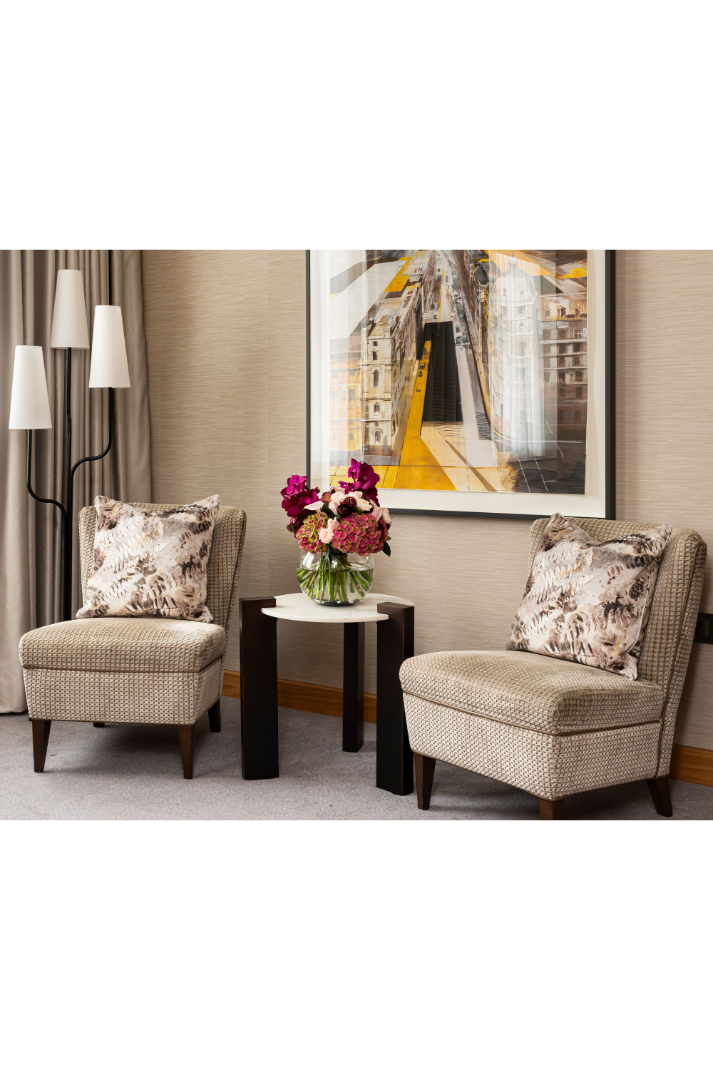 A linear silhouette and a refined color palette define the Tassimo Side Table — perfect for modern living rooms. It benefits from a stunning Marble and antique bronze metal design. Bold legs boast dramatic angles that create a standout accent for your living room. With its matching coffee table, this is an impressive interior statement.