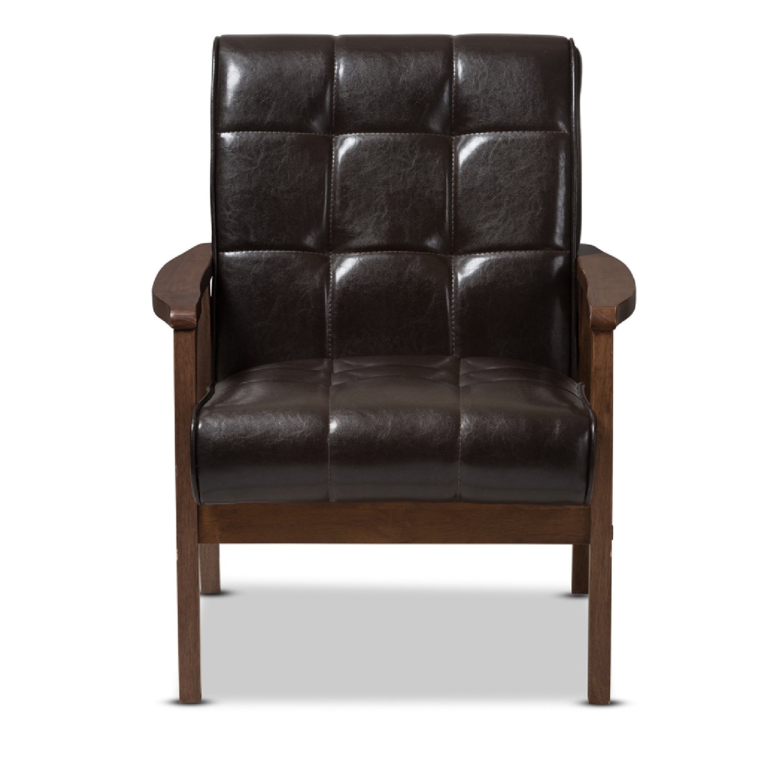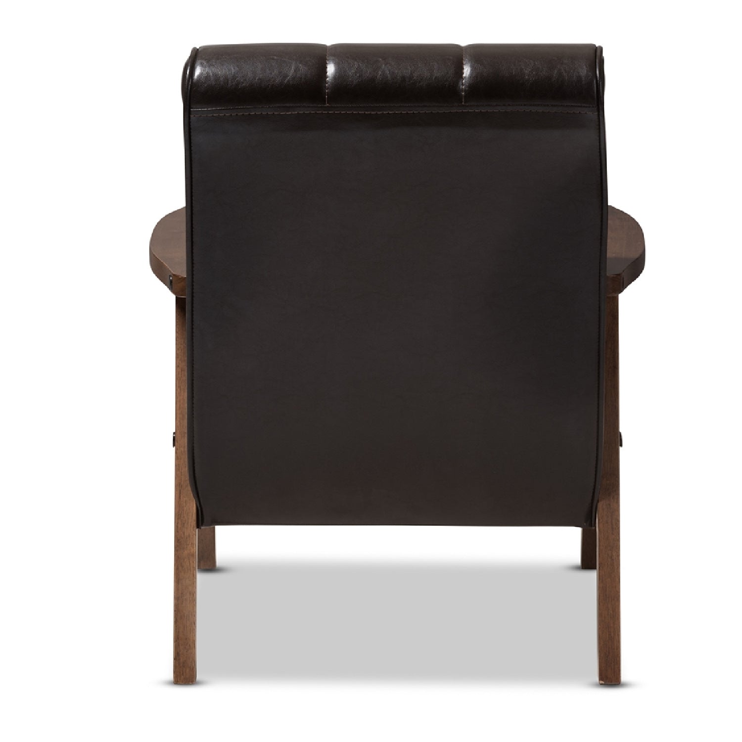Step slightly back in time to the postwar-prosperity years via the Baxton Studio Mid-Century Masterpieces collection. Inspired by the mid-century movement, our modern club chair combines a medium brown wood veneer finish and brown faux leather, foam-cushioned seat with solid rubberwood construction. The perfect accent arm chair for the contemporary-minded consumer on a budget. Slick, sleek and oh so chic.