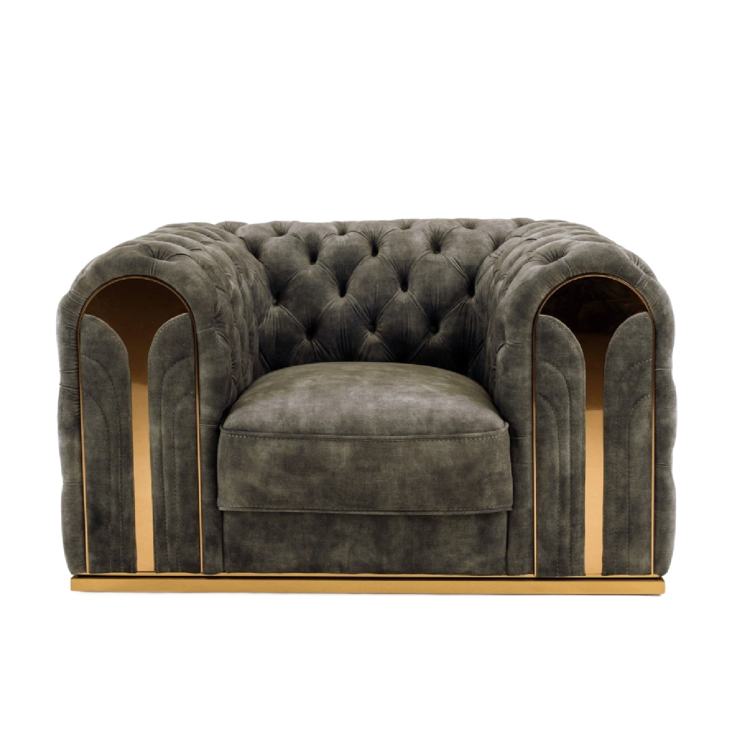 The Divani Casa Dosie Transitional Grey Velvet Sofa Chair is a sophisticated ensemble that combines comfort and elegance. Upholstered in a luxurious grey velvet fabric. The gold stainless steel legs and accents add a touch of opulence, while the button-tufted arms and back provide a classic look. With one throw pillows included, this chair is perfect for lounging. The eucalyptus wood frame, foam upholstery fill, and sinuous springs seat construction ensure durability and comfort. Whether for entertaining or relaxation, this chair exudes timeless charm and style.