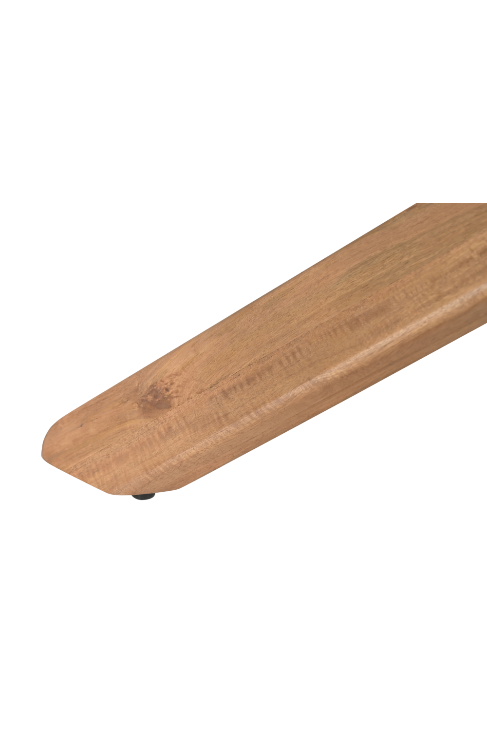 The Wesley dining table's base, crafted from three interlocking legs, creates a clean, crisscross structure that eliminates visible hardware. Mango wood, finished in vintage brown with a subtle sandblasted texture, creates a lighter hue that pairs with the airy base design for a contemporary feel.