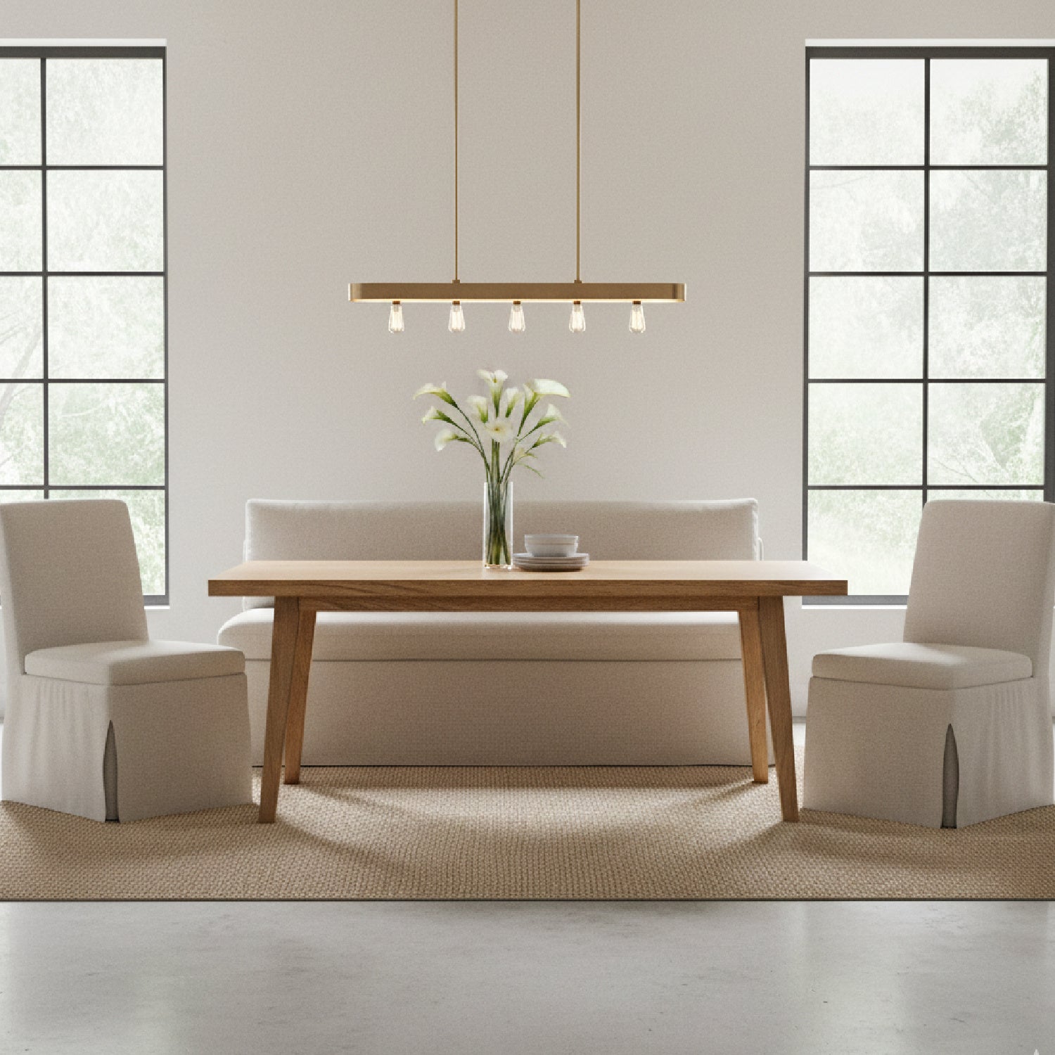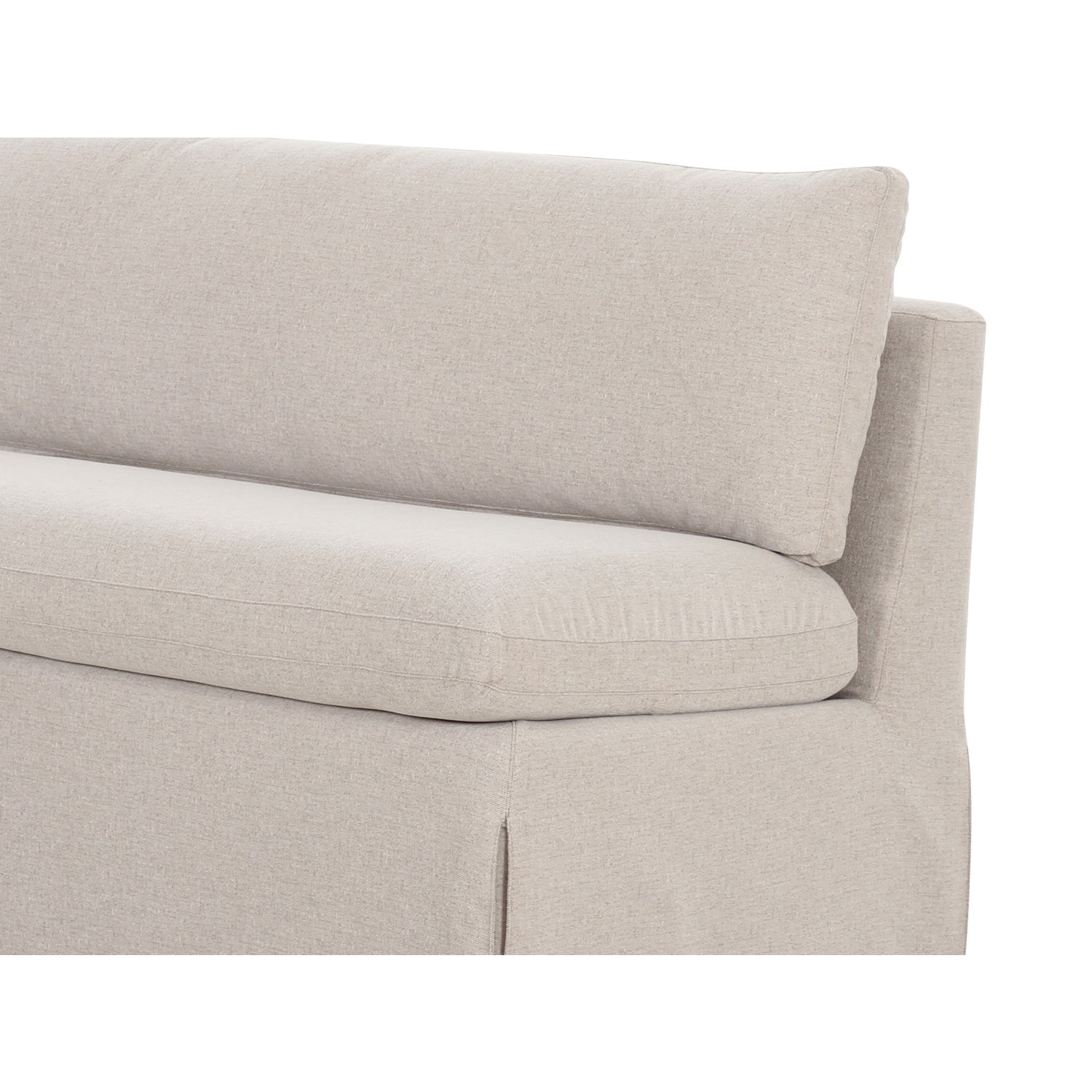 The Fable slipcover dining bench's snug-fitting, washable slipcover with inverted pleats offers a tidy appearance and effortless upkeep. A slight tilt encourages a relaxed seating posture with a pillow back and seat cushions for comfort. Designed to be modular, it includes alligator clips to connect with other pieces in the collection, adapting seamlessly to various dining table sizes.