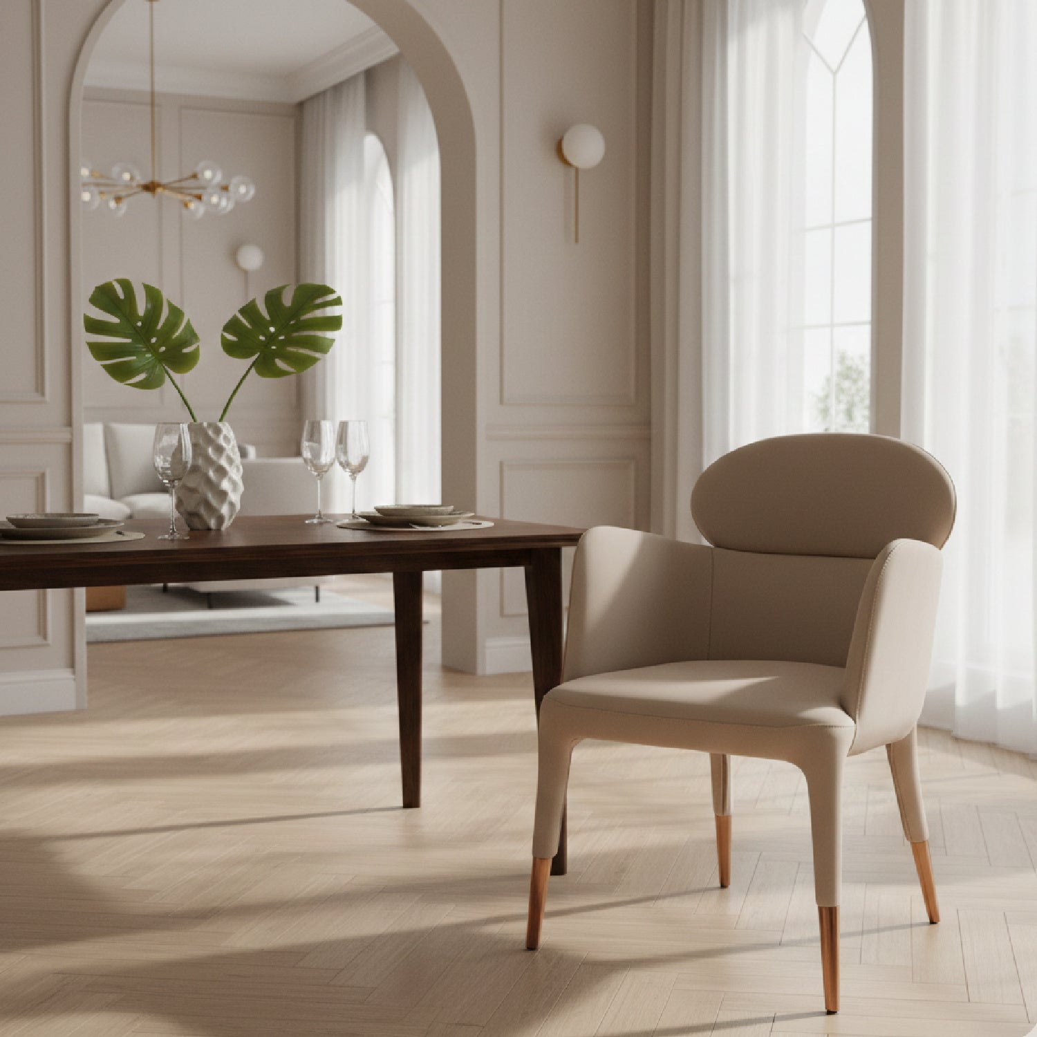 Introducing the Modrest Shannon Dining Chair, a striking blend of modern design and elegant materials. Upholstered in soft beige vegan leather, this chair features an inviting high back and gently curved armrests that enhance comfort while maintaining a sleek silhouette. The stylish rose gold legs add a contemporary touch, making it a perfect accent for any dining space. Its sophisticated design effortlessly complements various decor styles, creating an inviting atmosphere for dining and gatherings.