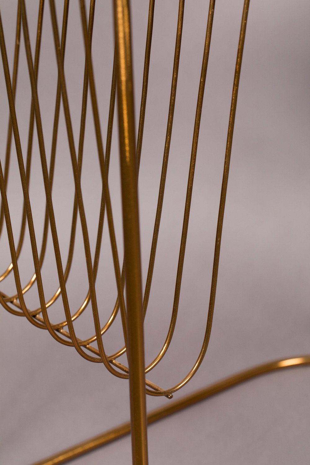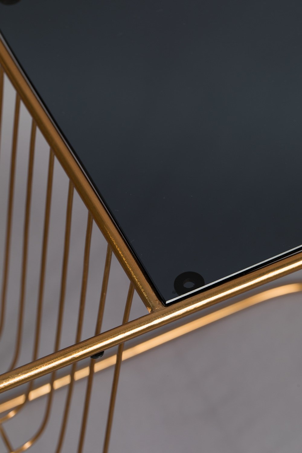 Eileen Side Table is the embodiment of elegance and style. The steel wire frame is finished with a classy golden color and it is a magazine holder and a table at the same time. The open frame supports a smoked tempered glass top that is ideal for placing drinks. This why Eileen side table brings a fine hotel lobby atmosphere right into your living area.