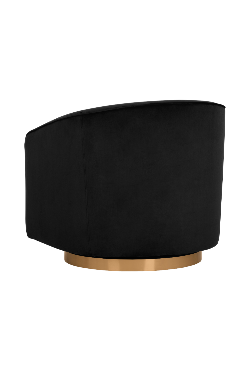 A stylish and comfortable swivel chair perfect for living, lounge and office spaces. Features a barrel back design upholstered in fabric. A brushed antique brass round base with 360 degree swivel completes the design.