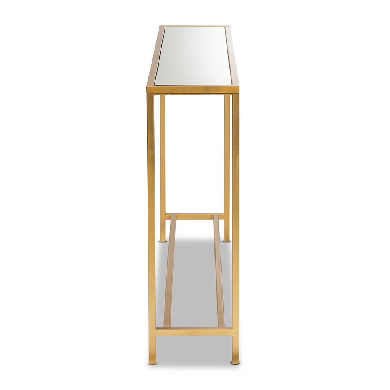 Add sleek, contemporary charm to your home with the stunning Alessa console table. The Alessa is comprised of a minimalist brushed gold finished metal frame fitted with a mirrored glass tabletop. Its slim silhouette, coupled with its large surface area, make the Alessa an ideal accent piece for entryways or hallways. Requiring assembly, the table is equipped with black non marking feet to protect floors. A beautiful pedestal for decorations or everyday items, the Alessa console table is a luxurious addition to the modern home.