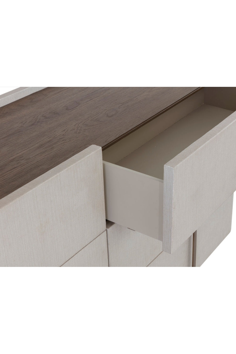 This contemporary dresser is defined by its beautiful and gentle curves. Wrapped in faux leather with a brown oak veneer tabletop that is sure to impress. Includes six drawers and is completed with a solid acacia wood base.