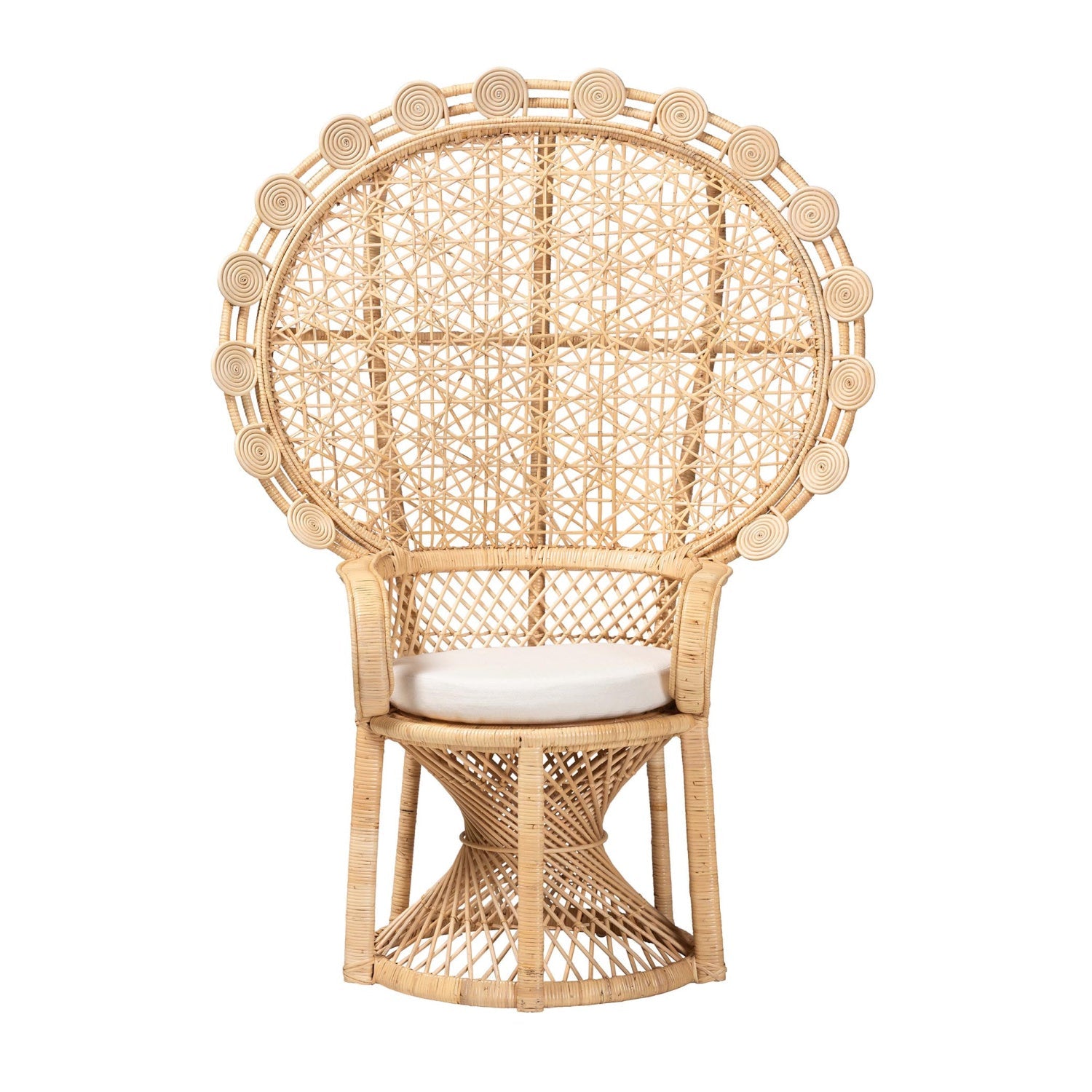 The beautiful Hecate peacock accent chair bears a character of bohemian grace. This exotic piece is meticulously handcrafted from natural rattan by skilled artisans. Curled geometric embellishments and beautiful webbing decorate its backrest for a truly captivating display while convenient armrests offer superb relaxation. The Hecate will arrive fully assembled and features a plush seat cushion padded with foam and upholstered in sumptuous fabric. Presenting vibrant yet serene grace, the Hecate peacock chair is sure to leave an impression. Disclaimer: Rattan is a product of nature and may have variations in areas such as, but not limited to, color, pattern, grain and texture. The hair-like strands of rattan/rattan-fiber are common due to the nature of the material.