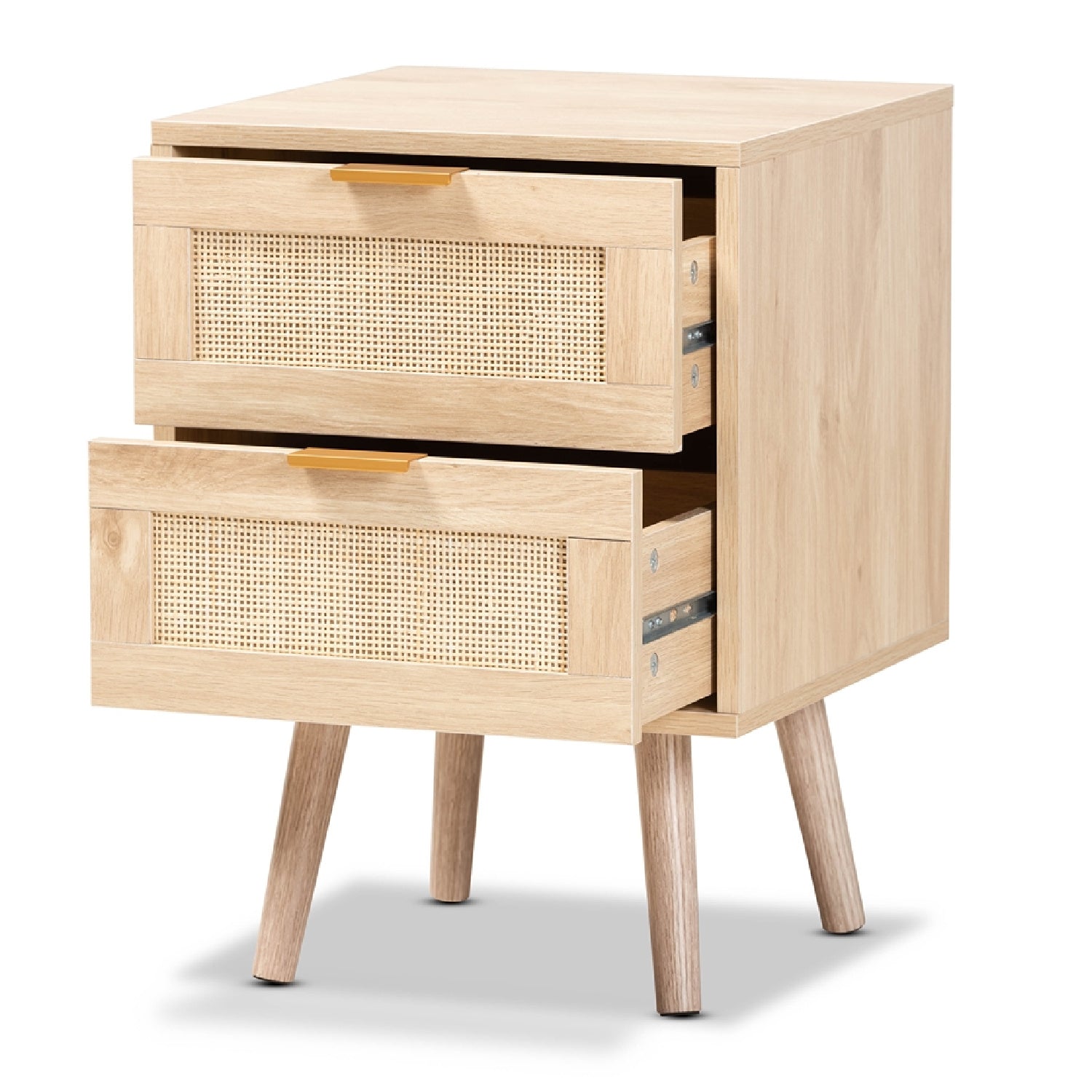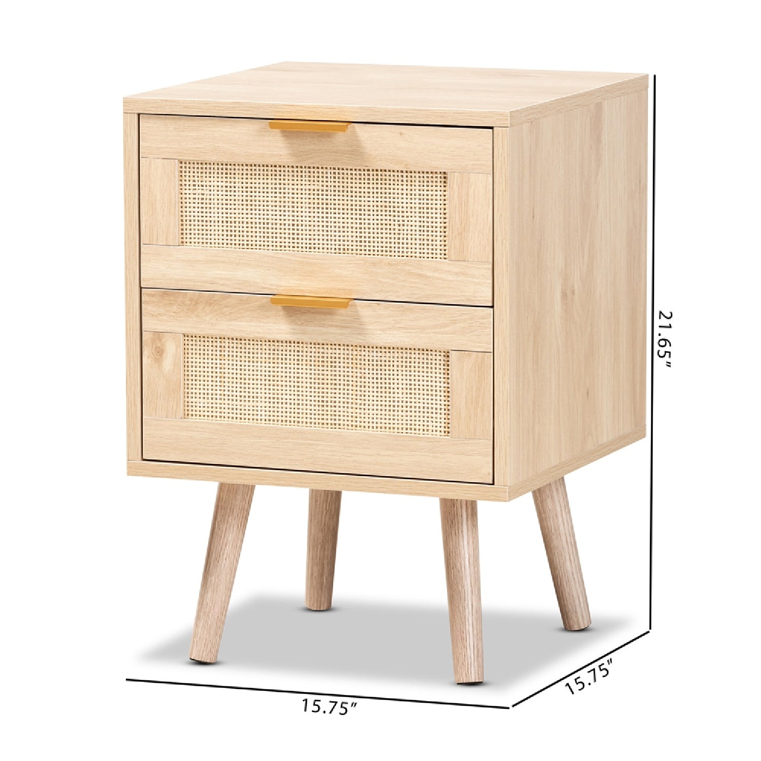 Add a retro inspired accent to your interior with the stunning Baird end table. The Baird is comprised of sturdy wood showcasing a light oak brown finish. Two drawers and a square tabletop offer plenty of space for a variety of household essentials. Requiring assembly, the end table features woven rattan drawer faces and gold tone metal handles for eye catching style. A handy piece brimming with personality, the Baird end table is sure to enhance any layout. This is a product of nature and may have variations in areas such as, but not limited to, color, pattern, grain and texture. The hair-like strands of rattan/rattan-fiber are common due to nature of the material.