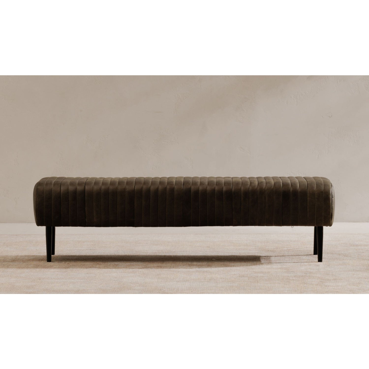 Distinguished by its unique and timeless elegance, the breathtaking essence of the Endora bench creates a sophisticated ambiance in any space. Smooth, top-grain cowhide leather in a ribbed style quilting set off by slim, tapered matte brass finished legs add just the right touch of comfort and refined luxury.