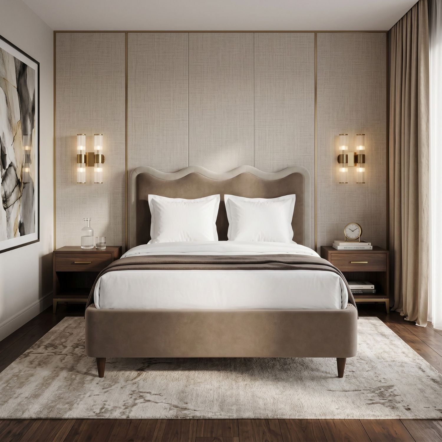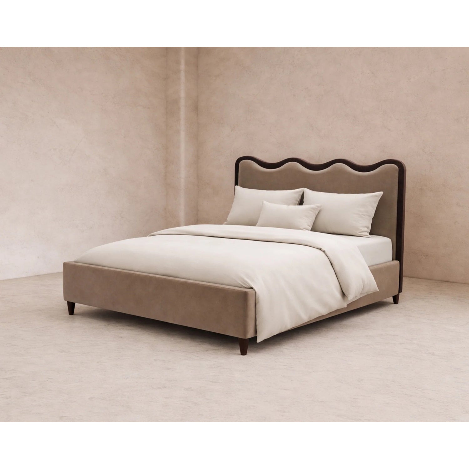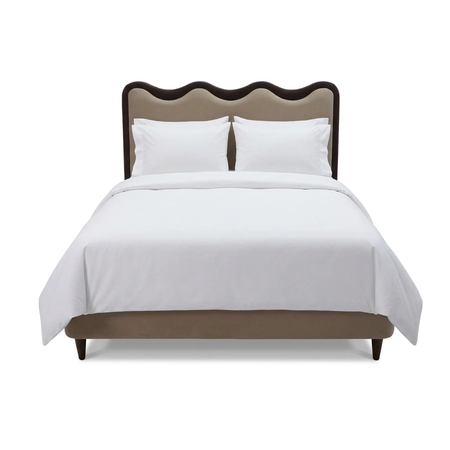 Rhythmic, scalloped detailing meets high-contrast definition in a silhouette designed for high-end impact. The Palermo Bed features a masterfully upholstered headboard in warm Hopper Desert, framed by a bold Hopper Terra border that accentuates its playful, undulating wave. Elevated by tapered Dark Brown Ash legs, this piece offers a sophisticated, editorial anchor that balances whimsical form with professional restraint perfect for adding a curated, graphic element to the modern bedroom.