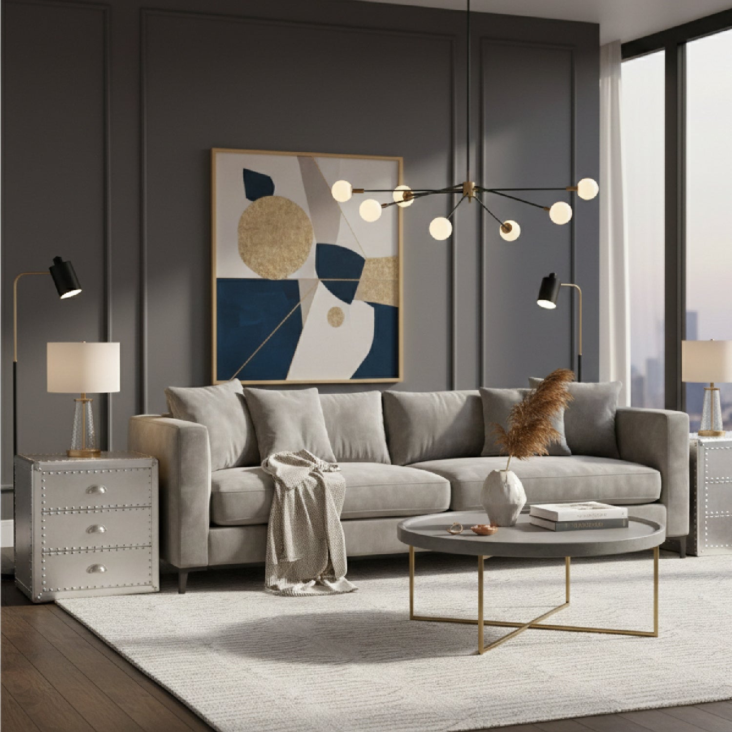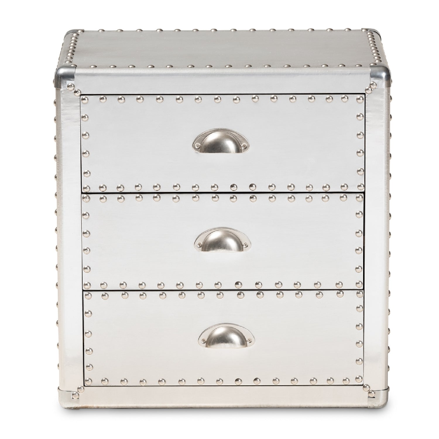Bring chic industrial style into your space with the Armel end table. Constructed from wood and metal, this silver end table features cool rivet detailing along its edges. Three drawers provide space to keep household essentials organized. Polished silver metal drawer handles add a sleek touch. Inspired by vintage storage trunks, the Armel is fitted with corner protectors. Use this piece as an accent in the living room or other shared space. The Armel end table is made in China and will arrive fully assembled.