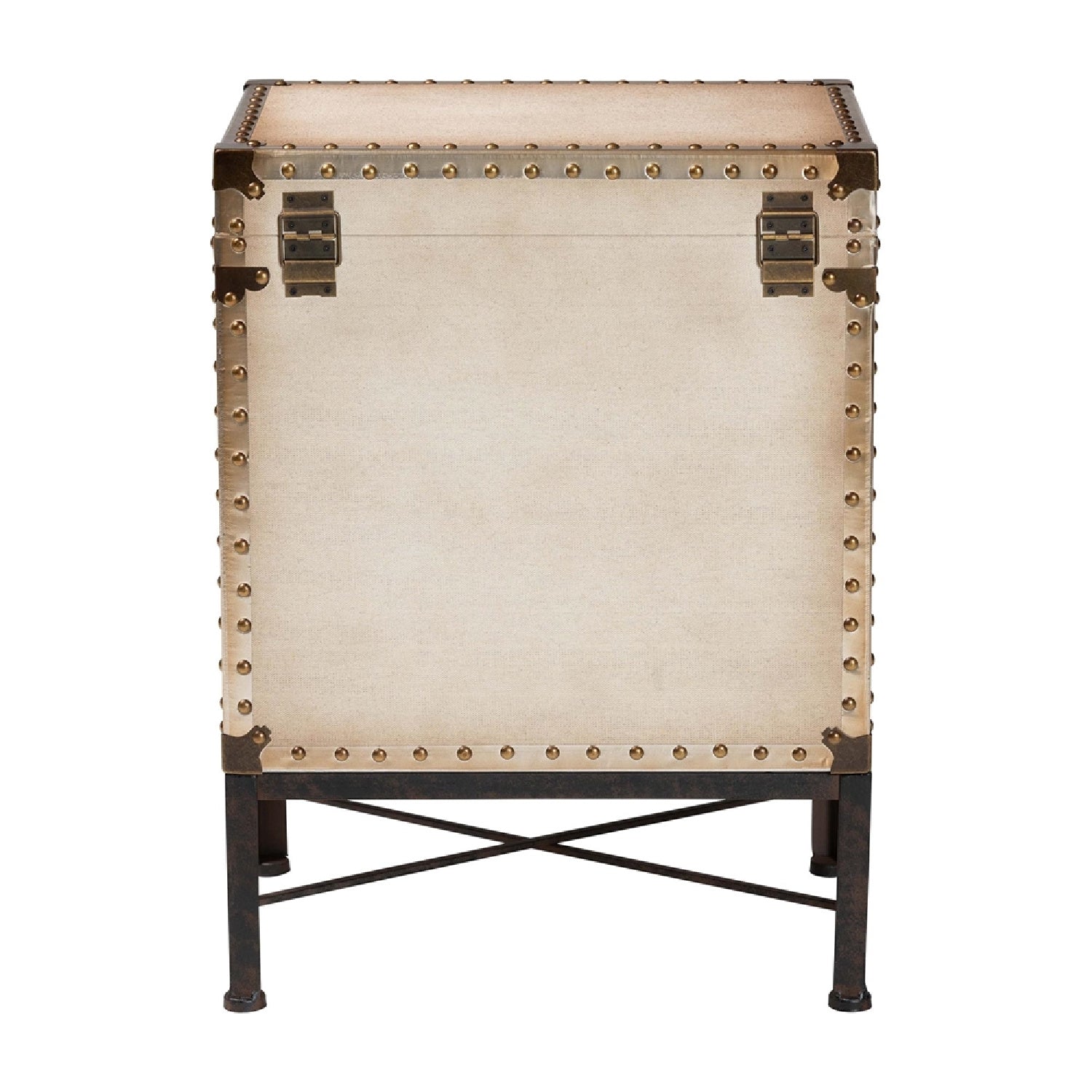 Lend a touch of industrial-style flair to your space with the stunning Laura end table. This vintage inspired piece consists of a sturdy wood frame wrapped in smooth canvas. Metal-plated edges and studded embellishments highlight the robust nature of the piece while the lift-top compartment offers convenient storage. The Laura will arrive fully assembled and utilizes minimalist metal base with rounded legs for excellent stability and support. Beautifully shaped leather strips complete the look, making the Laura end table an enthralling addition to any space.